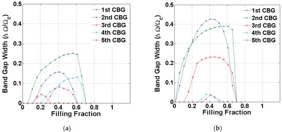 We show, in Figure 4, the complete band gap widths (only for the first five band gaps) between XY modes (a) and Z modes without piezo effects (b) as a function of filling fraction for circular scatterers and Kagomé lattice. Note that is the central normalized frequency of the band gap.