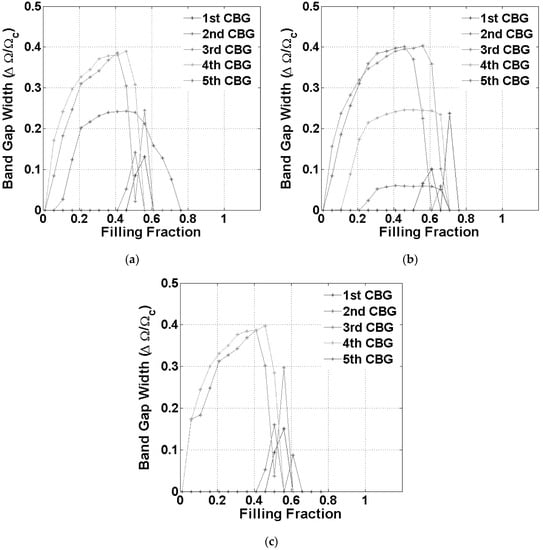 The results in Figure 4 are quite different from that those reported by Wang et al. [11]. The band gap widths of the Z modes (b) were higher than the XY modes (a) and were opened in a broad range of filling fraction. We illustrate, in Figure 5, the complete band gap widths (only for the first five band gaps) between Z modes with piezoelectricity (a), Z modes with piezomagnetism (b), and Z modes with both piezo effects (c) as a function of filling fraction for circular scatterers and Kagomé lattice. Wang et al. [11] did not investigate the effect of only piezoelectric (a) and piezomagnetic (b) effects on the band gap width.