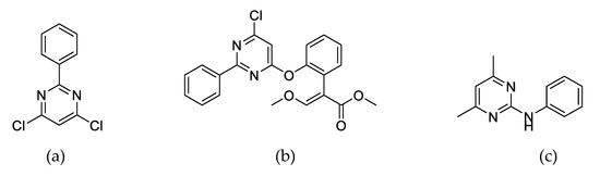 Azoxystrobin (Figure 1b) and pyrimethanil (Figure 1c) are commercial pyrimidine fungicides. Azoxystrobin, named methyl (E)-2-{[6-(2-cyanophenoxy)-4-pyrimidinyl]oxy}-alpha-(methoxy methylene)benzeneacetate, belongs to the strobilurin fungicides, and was commercialized in 1996. Azoxystrobin stably held 23–25% of the fungicide market share until 2016. Azoxystrobin is a broad-spectrum fungicide and that displays strong activity against plant fungi such as ascomycetes, deuteromycetes, and oomycetes in crop plants, vegetables, and fruits [14]. Azoxystrobin causes the mitochondrial respiration of pathogenic fungi to be hindered, by binding to the Q0 site of cytochrome bc1 enzyme complex to block electron transfer and freeze adenosine triphosphate (ATP) production [15]. Pyrimethanil, named 4,6-dimethyl-N-phenylpyrimidin-2-amine, was commercialized in 1991 and controlled plant fungi such as pear scab (Venturia pirina) and gray mold (Botrytis cinerea) in agricultural product [16]. It acts as an athogenesis inhibitor to inhibit the secretion of cell wall degrading enzymes in plant fungi [17].