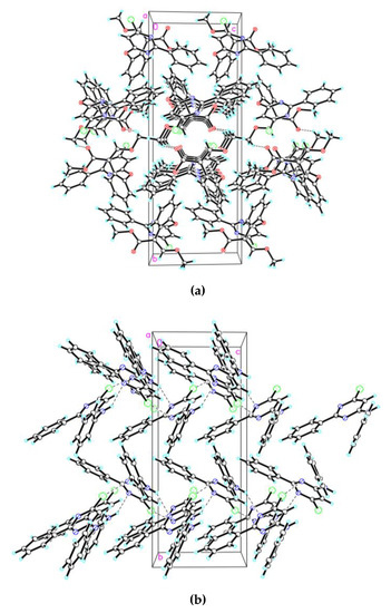 Compounds 6 and 7 both crystallized in the monoclinic system, with a P21/c space group and Cc space group, respectively. The molecular structures of compounds 6 and 7 are described in Figure 2a,b, and selected molecular structure parameters, including bond lengths and bond angles for compound 6 and 7, are listed in Table 2 and Table 3, respectively. Packing diagrams of compounds 6 and 7 are shown in Figure 3a,b respectively.