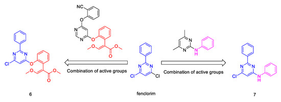 The linking of active sub-structures to compounds is a common method for identifying novel pesticides [18,19,20]. Here, in order to find new fungicide candidates with high efficiency, two fenclorim derivatives (compound 6 and 7) were synthesized via the linking of active sub-structures. This was achieved by combining the (Z)-methyl 2-iodo-3-methoxyacrylate group substituted phenoxy group (red) in azoxystrobin and the aminophenyl group (pink) in pyrimethanil (Scheme 1). The chemical structures of compounds 6 and 7 were confirmed by NMR spectroscopy, high-resolution mass spectrometry (HRMS) and X-ray diffraction analysis. Their fungicidal activity against Botrytis cinerea (B. cinerea), Pseudoperonospora cubensis (P. cubensis), Erysiphe cichoracearum (E. cichoracearum), Blumeria graminis (B. graminis), Rhizoctonia solani (R. solani), and Puccinia polysora (P. polysora) were evaluated. These results provide useful guidance for designing novel fungicides using fenclorim as a lead compound.