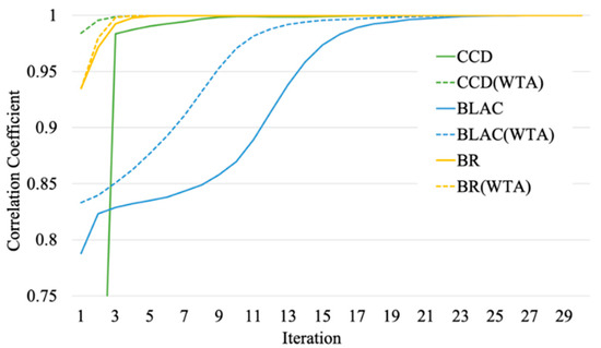 Correlation coefficients between intermediate and final merged models. The solid lines show the data with the “weighted” merging strategy, and the dashed lines show the data with the “winner-takes-all” (WTA) strategy.