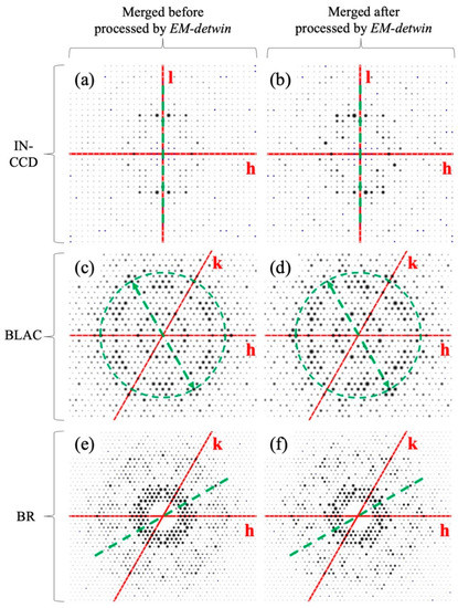 Differences between merged diffraction intensities before and after being processed by EM-detwin. (a,b) Diffraction intensities on the (h,0,l) plane of the Integrase Catalytic Core Domain (IN-CCD), where the green dashed line represents the twinning symmetry “(h,0,l) = (−h,0,l)”; (c,d) (h,k,5) plane of Beta-lactamase (BLAC) reflections, where the green arrows indicate the twinning symmetry “(h,k,5) = (−h,−k,5)” (central symmetry in planes for fixed l); (e,f) (h,k,0) plane of BR reflections, where green dashed line represents the twinning symmetry “(h,k,0) = (k,h,0)” (rotational symmetry).