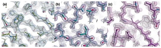 The merged data after detwinning was used to build atomic models and refine protein structures. The phenix.phaser program was used to build the initial model using a molecular replacement method. Then the model was refined using the phenix.refine program. The default parameters in phenix.phaser and phenix.refine were applied. The resolution limits were set to be the same as in the published structures. Merged data from original stream files without detwinning were used for structure refinement as control groups. The final R-work and R-free values of model refinement are listed in Table 5 (see Supplementary Table S1 for the complete statistics of structure refinement). The electron density maps are shown in Figure 3 for the three structures, which are calculated based on the merged data by the EM-detwin program.