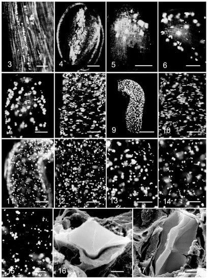 - Lersten, N.R. Crystals of calcium compounds in Gramineae. New Phytol. 1983, 93, 633–637. [Google Scholar] [CrossRef]