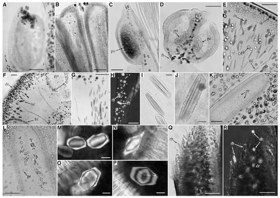 - Coté, G.G.; Gibernau, M. Distribution of calcium oxalate crystals infloral organs of Araceae in relation to pollination strategy. Am. J. Bot. 2012, 99, 1231–1242. [Google Scholar] [CrossRef] [PubMed]