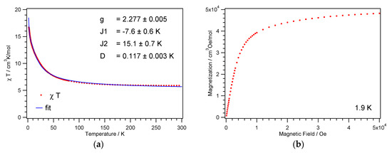 This coupling scheme with the corresponding energy levels, including Van Vlecks’ equation for the magnetic susceptibility and the zero field splitting Hamiltonian, has already been described by Escuer et al. [56]. For 1, the best fit to the χMT product was achieved with parameter values for the g-factor g = 2.28, the antiferromagnetic exchange parameter J1 = −7.6 K, and the ferromagnetic exchange parameter J2 = 15.1 K. The resulting spin ground state, ST = 4, shows a small zero field splitting D = 0.12 K, which is responsible for the continuous increase of the χMT values towards lowest temperatures, see Figure 5. The fit returns well-defined values for g and D; the parameters J1 and J2 are counteracting and exhibit larger error bars. The antiferromagnetic exchange J1 is attributed to the Ni1–O2–Ni1′ and Ni2–O5–Ni2′ paths with Ni–O–Ni angles close to 101.5°, see Figure 3a and Table 2. The ferromagnetic exchange J2 represents an average over the remaining four paths, with Ni–O–Ni angles ranging from 94° to 98°.