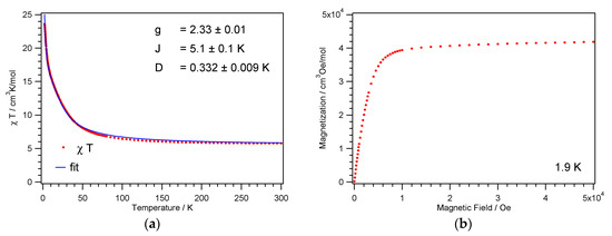 The temperature dependence of the magnetic susceptibilities of the complexes 1 and 2 were each measured on powder samples over the temperature range 1.9–300 K in a 1 kOe magnetic field. Transmission powder X-ray analysis was utilized to ensure that the single-crystal data were representative of the bulk material (Supplementary Materials Figure S2). At room temperature, the χMT product of 1 and 2 amounts to 5.9 and 5.8 cm3 K mol−1, respectively, and is thus greater than the spin-only value of 4.0 cm3 K mol−1 for four noninteracting NiII ions with S = 1 and g = 2. Between 300 and 100 K, the χMT product for 1 and 2 increases slowly; when below 100 K the values increase more rapidly reaching a value of 17 and 24 cm3 K mol−1, respectively (Figure 5a and Figure 6a). This increase in the χMT product is indicative of dominant intracube ferromagnetic interactions between the paramagnetic centers. This goes in line with the 1/χM vs. T plot, where the data above 200 K follow the Curie–Weiss law with a positive Weiss constant θ of 7.0 and 6.8 K, respectively (Figure S3).