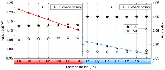 Variation of the Ln ionic radius (circles) and in the axial ratio (stars) for light Ln bearing orthophosphates with 9-coordination for light Ln ion (red colour), and heavy Ln bearing orthophosphates with 8-coordination ed Ln ions (blue colour). The axial ratios are calculated from the information published in Refs. [26,27,28,29,30,31,32,33].