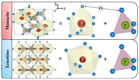 The and orthophosphates are differentiated by crystallochemical partitioning, where the latter is formed by eight coordinated O polyhedra of ion and PO tetrahedra, Figure 3(bottom). Due to the greater ionic radius of La as compared to Lu, and a decrease in the ionic radii with an increasing atomic number for orthophosphates, one corner of adjacent PO tetrahedra rotate towards the ion transforming O to O polyhedra.