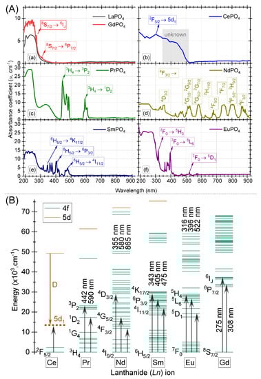 (A) The UV-visible absorption spectra for various light bearing orthophosphates, (B) Energy level diagram for LREEs (in vacuum). The prominent absorption peaks are marked with upward arrows.