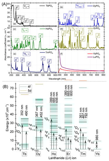 (A) The UV-visible absorption spectra for various heavy REE bearing orthophosphates; and (B) Energy level diagram for HREEs (in vacuum). The prominent absorption peaks are marked with upward arrows.
