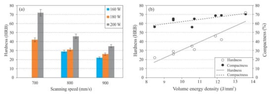 According to Table 1 and Figure 2, scanning parameters have significant effects on the hardness and compactness of the samples. Figure 2a indicates that sample hardness decreases monotonically with increasing scanning speed, whereas it increases with an increase in the laser power. Looked at from another perspective in Figure 2b, however, these results show that sample hardness increases monotonically with the volume energy density overall, which is actually due to the modest improvement of sample compactness. Within the tested scanning parameters, the attached sample compactness ranges from 55.95% to 70.23%, while the sample hardness ranges from 22 HRB to 72 HRB.