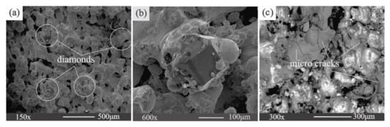 SEM images of metal matrix diamond composite (MMDC) samples manufactured by SLM, showing the occurrence of diamond particles and microstructure features of metal matrix: (a) Diamond distribution and high porosity of MMDC; (b) an undamaged diamond particle and its wrapped morphology; (c) micro-cracks on a metal matrix.