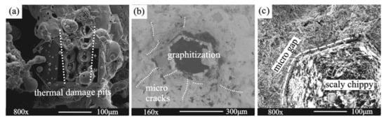 Figure 4a shows a diamond particle located exactly on the laser scanning path that resulted in two rows of thermal damage pits along the laser scanning direction on that surface. The damage pits were caused by high laser power, and the depth and numbers of the pits were closely related to laser power and scanning speed. However, Figure 4a shows that the damage was limited, because the crystal shape and other diamond surfaces are still intact. Figure 4b shows that the thermal damage caused by vacuum brazing is mainly manifested as surface graphitization []. The thickness of the graphite layer is closely related to the brazing material compositions and the brazing process. Additionally, as a result of the high brazing temperature, micro-cracks might be induced within the metal matrix. Figure 4c shows the extreme graphitization of a diamond particle caused by hot-pressing sintering []. The diamond crystal surface and crystal shape both deteriorated due to the scaly chipping on the diamond particle surfaces. There is no metallurgical bonding between the diamond particles and metal matrix. Therefore, the diamond particle is just mechanically embedded in the metal matrix, which leads to an obvious micro-gap at the interface of the diamond particle surface and metal matrix.