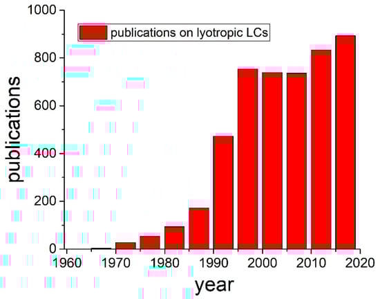 Lyotropic liquid crystals (LLCs) [1,2] are known from before the time of the discovery of thermotropics by Reinitzer in 1888 [3], which is generally (and rightly) taken as the birth date of liquid crystal research. In the work before this time, for example by Virchow [4], Mettenheimer [5], Planer [6], Loebisch [7] or Rayman [8], the liquid crystalline properties were described, but without the explicit realization that this constituted a novel state of matter. The latter was the significant contribution made by Reinitzer [3] in 1888 and Lehmann [9], who coined the term “liquid crystal” in 1889 when studying thermotropic phases. Nevertheless, lyotropic liquid crystal research has been present ever since, albeit on a lower quantitative output than that of thermotropic systems, also because of their less obvious potential in applications, being overshadowed by displays and electro-optic devices. But, as thermotropic liquid crystal research surged in the 1970’s to the 2000’s, so did that of lyotropic liquid crystals (Figure 1), due to the realization of their importance for biological systems and in colloid science.