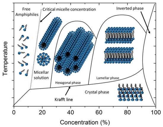 Amphiphilic molecules have the striking property of presenting two antagonistic characteristics within the same molecule, i.e., hydrophobicity and hydrophilicity. In contact with polar and/or nonpolar liquids, under proper temperature and relative concentration conditions, they form lyotropic liquid crystalline phases [1]. Nanoscale molecular segregation (self-assembly) gives rise to different molecular aggregates, from micelles to bicontinuous structures. There are different types of amphiphilic molecules, such as anionic, cationic, zwitterionic and non-ionic amphiphiles, detergents and anelydes [10]. Moreover, other more complex molecules belong to this category, the gemini surfactants [11], the rigid spiro-tensides, phospholipids [12], the facial amphiphiles [13] and the bolaamphiphiles [14]. The lyotropic polymorphism encountered in mixtures with amphiphilic molecules is very rich. Figure 2 shows a sketch of a typical lyotropic liquid crystal phase diagram of a mixture composed by an amphiphile and water. The Krafft line separates the crystalline phase region from the liquid region. The critical micelle concentration line separates the single amphiphilic molecule region from the molecular self-assembled region. By increasing the amphiphile relative concentration, the mixture can present the micellar, hexagonal, lamellar and inverted phase structures. A well-known biological example for lyotropic lamellar structures is the lipid bilayers of cell membranes, as shown in Figure 3a. Other examples are Myelin figures.