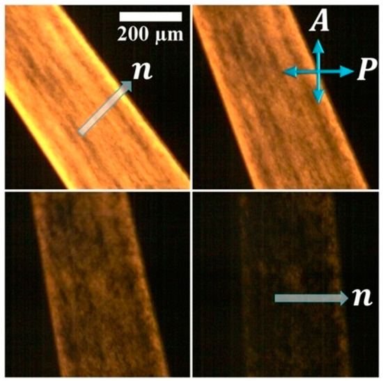 - Horowitz, V.R.; Janowitz, L.A.; Modic, A.L.; Heiney, P.A.; Collings, P.J. Aggregation behavior and chromonic liquid crystal properties of an anionic monoazo dye. Phys. Rev. E 2005, 72, 041710. [Google Scholar] [CrossRef]