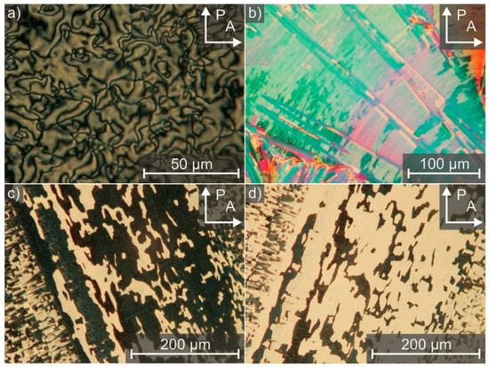 Different textures of the lyotropic SmC* phase. (a) SmC* Schlieren-texture, (b) broken fan-shaped chevron texture with typical zig-zag lines, and (c) and (d) surface stabilized SmC* domain texture, rotated by twice the tilt angle respectively, leading to mutually dark and bright domains (reproduced with permission from Reference [18]).