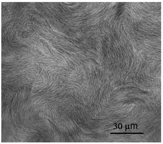 Texture of a living liquid crystal with disclination pairs. The bacteria are aligned along the local nematic director, seen by the lines in the textures (reproduced with permission from Reference [155]).