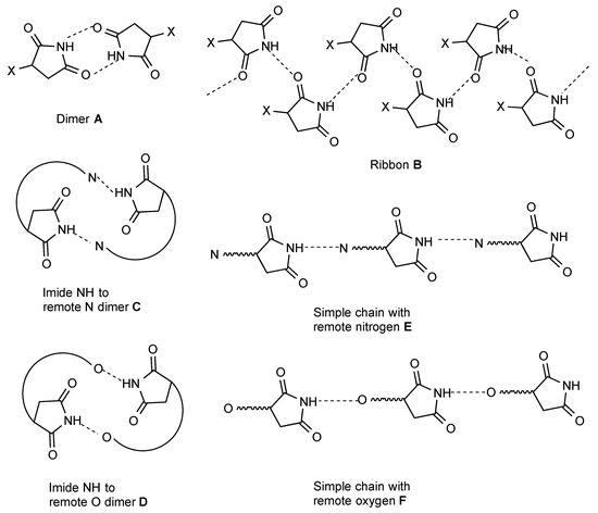 Two separate structures have been published for the parent succinimide 32 [37,38] (Figure 13), both of which involve hydrogen-bonded dimers A.