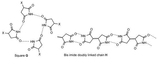 There are a few less common patterns of hydrogen bonding which do nonetheless occur several times. Four molecules may hydrogen bond in a square array (pattern G, 2 examples). For bis imides the simple dimer form A translates to a doubly linked chain (pattern H, 11 examples).