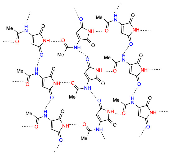 Two separate structures have been published for the parent maleimide 1 [6,7] (Figure 3), both of which involve hydrogen-bonded dimers A. Among the three monosubstituted maleimide structures located two, compounds 2 [8] and 3 [9] (Figure 3), involve a linear hydrogen-bonded ribbon structure B. The remaining compound 4 [10] involves a more complex pattern in which each imide NH is hydrogen bonded to the acetyl CO forming the link between chains of molecules joined by bonding of one of the imide carbonyls to the acetylamino NH (Figure 4). In graph set notation C(7) chains of category F combine with C(6) to give R44(21).