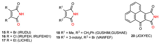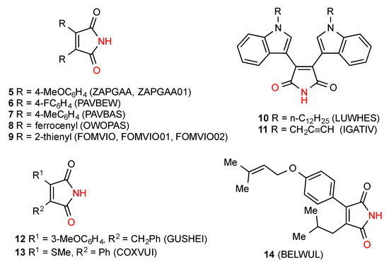 Of the 27 3,4-disubstituted maleimide structures located, the most commonly observed pattern is the hydrogen-bonded dimer A. The 13 structures noted as exhibiting the dimeric R22(8) bonding pattern are made up of both symmetrical (where the substituents on the ring are the same) compounds 5 [11,12], 6 [12], 7 [12], 8 [13], 9 [14,15], 10 [16] and 11 [17] and unsymmetrical examples 12 [18], 13 [19,20] and 14 [21] (Figure 5).