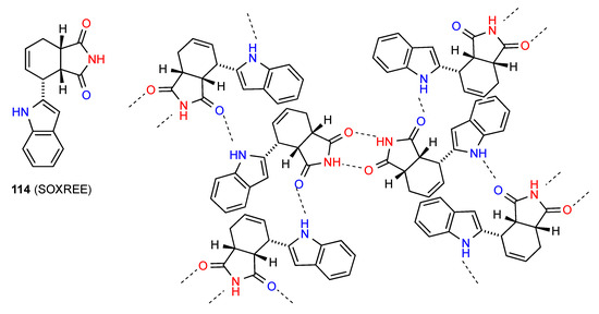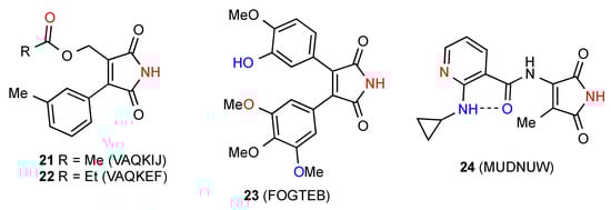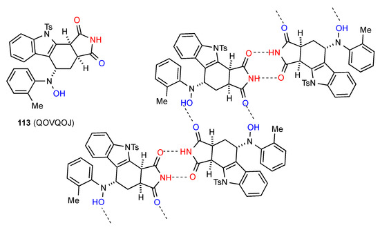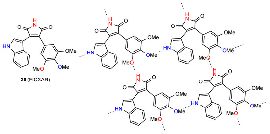 The Hydrogen-bonding pattern of compound 26 [30,31] (Figure 9) involves parallel rows of molecules in which there is a C(8) interaction between imide NH and OMe at the 3-position of the 3,4,5-trimethoxyphenyl substituent. These are then cross-linked by additional C(11) bonding between the OMe at the 4-position and the indole NH giving a 2-dimensional array containing R44(31) units.