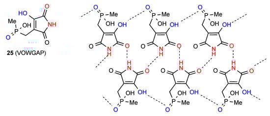The two remaining structures in this category exhibit more complex patterns of hydrogen bonding. In compound 25 [29] (Figure 8) the ribbon structure of pattern B is further reinforced by OH to P=O hydrogen bonding. This basic pattern can be described as C(4) combining with C(7) to give R33(16). Additional interactions between the P–OH group and the P=O of an adjacent ribbon make for a complex overall structure.