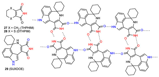 Of the five structures located for ring fused maleimides, two, compounds 27 [32] and 28 [33] (Figure 10), form a linear ribbon of pattern B. The other compounds all form more complex patterns involving groups other than the imide in hydrogen bonding. Compound 29 [34] forms a ribbon structure in which the NH of the imide and the CO away from the NH of the seven-membered ring form a simple R22(8) dimer. These dimer units are then connected to each other by the supplemental C(8) interaction of the other imide CO with the indole NH of the next unit to give the pattern shown which contains R44(22) units (Figure 10).