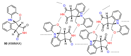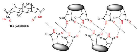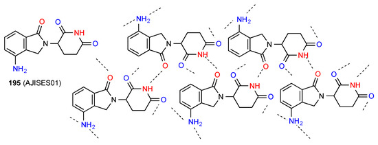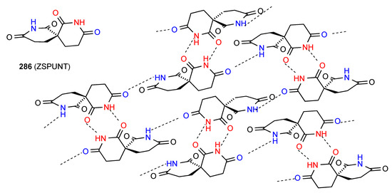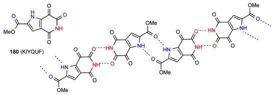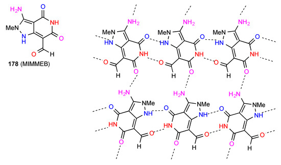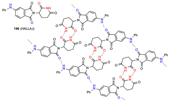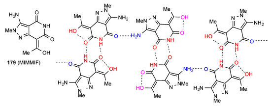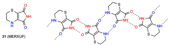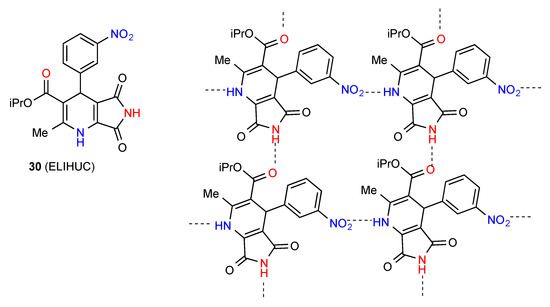 Compound 31 forms dimers of pattern A by imide NH to CO interaction and these are then further linked in a zig-zag arrangement by dimer formation between the other imide CO and the six-membered ring NH (Figure 12) [36]. This gives an overall designation of C(10)[ R22(8), R22(10)].