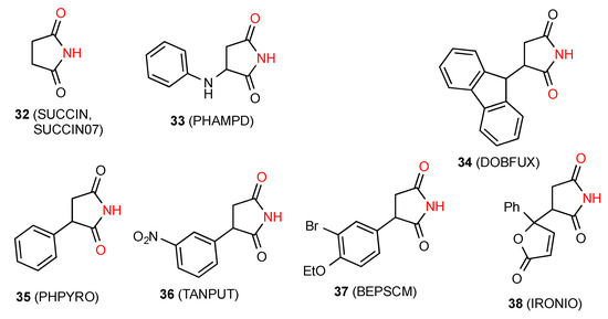 Two of the twelve structures located for monosubstituted succinimides, compounds 33 [39] (Figure 13) and 34 [40] exist as simple hydrogen-bonded dimers A. A further four compounds: 35 [41], 36 [42], 37 [43] and 38 [44] show linear hydrogen-bonded ribbons of type B. It is interesting to note the variation among these examples in whether it is the carbonyl nearer or more remote from the substituent that is involved in bonding.