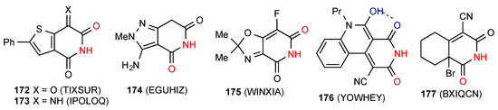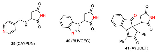 In compounds 39 [45] and 40 [46] (Figure 14) the NH of the imide is linearly bonded to a remote heterocyclic nitrogen in the next molecule (pattern E, C(10) and C(7), respectively). One reported structure, the compound 41 [47], forms linear C(7) chains with the NH of the imide interacting with a remote ketone oxygen on the next molecule (pattern F).