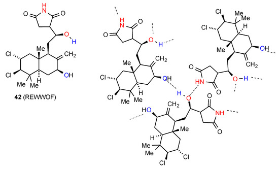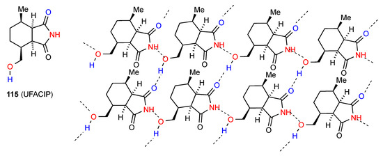The three remaining structures all exhibit distinct and more complex patterns of hydrogen bonding. In compound 42 [48] (Figure 15) the imide NH bonds to the oxygen atom of the acyclic secondary alcohol group of another molecule (C(6)), with the hydrogen atom of that alcohol further bonding (C(8)) to the ring secondary alcohol in a third molecule. Since each molecule has two donor sites and two acceptor sites, the end result is a complex three-dimensional network.