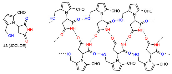 In compound 43 [49] (Figure 16) two parallel chains of molecules are hydrogen bonded to each other in a C(4) fashion or pattern B. Additionally, the other imide CO of the molecule links with the OH on the pyrrole ring of the next molecule in a C(8) chain, leading to formation of R33(17) units.