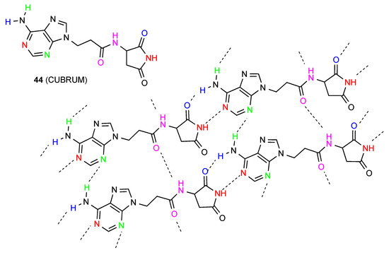 Compound 44 [50] (Figure 17) has a complex hydrogen-bonding system with no fewer than four separate interactions which leads to a two-dimensional network. The molecules are arranged in C(13) chains linked both by bonding between the imide NH and the 3-N of adenine and between the CO of the same imide and one NH of the adenine 4-amino substituent forming R22(8) units. Cross-linking between the chains is also observed with C(6) interactions between the other NH of the 4-amino substituent and 1-N of adenine and C(4) between an amide carbonyl of one chain and the amide NH of the next.