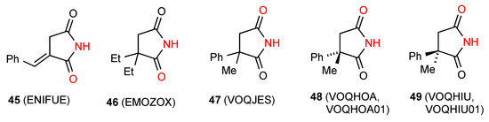 Eleven structures were located for 3,3-disubstituted succinimides. Two of these structures, compounds 45 [51] and 46 [52] (Figure 18) show simple dimer hydrogen-bonding of pattern A. Five reported structures of three compounds: racemic 47 [53], (S)-48 [53] and (R)-49 [53] exhibit linear ribbon type hydrogen-bonding (pattern B). It is again interesting to note that the carbonyl nearer the substituent is involved in the former cases whereas in the latter, it is the one away from the substituents.
