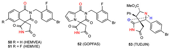 Three reported structures of compounds 50 [54], 51 [54] and 52 [55] (Figure 19) show linearly hydrogen-bonded C(8) chains with the NH of the succinimimide bonded to the more remote of the two six-membered ring imide CO in pattern F. The remaining structure, compound 53 [56] involves a linear C(6) chain of type E with the NH of the imide bonded to the remote pyrrolidine nitrogen of the next molecule with an additional intramolecular S(6) interaction of the imide CO and the pyrrolidine NH as shown.