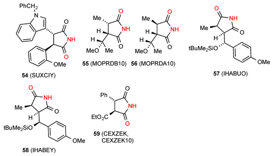 Of the nine structures located for 3,4-disubstituted succinimides, five structures viz. compounds 54 [57], 55 [58], 56 [58], 57 [59] and 58 [59] (Figure 20) exist as hydrogen-bonded dimers, pattern A. Two reported structures of compound 59 [60,61] exhibit linear ribbons of pattern B.