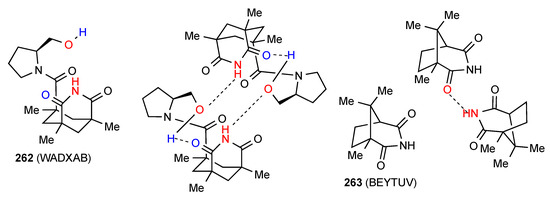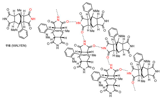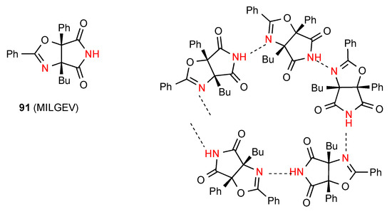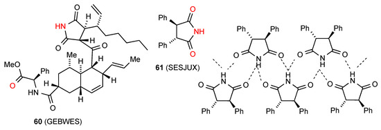 Compound 60 [62] (Figure 21) exhibits type F hydrogen bonding with the imide NH-bonded to the remote ester CO in a single linear C(15) chain. The remaining compound 61 [63] exhibits a rare double-hydrogen-bonded ribbon pattern with two parallel rows and each imide NH bonded equally to the CO of two different molecules to give a C21(4)[R22(8)] pattern. It is notable that within this racemic compound the molecules are arranged in complementary rows consisting each of a single enantiomer.