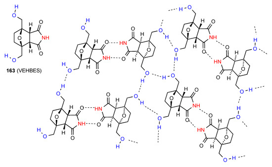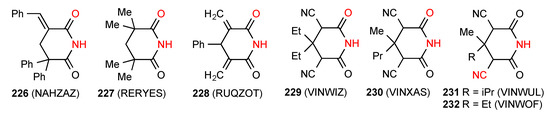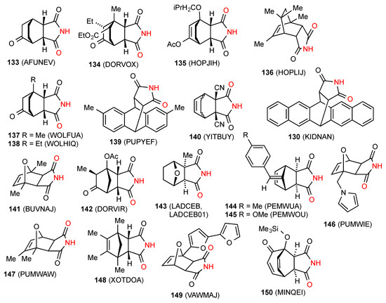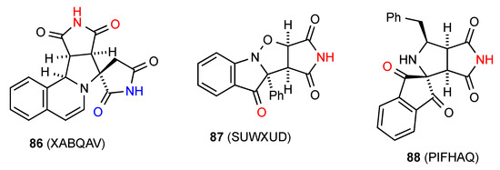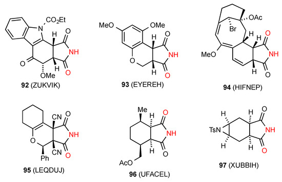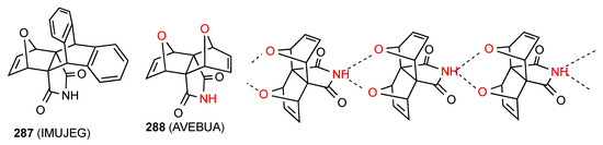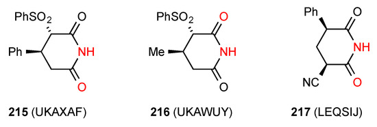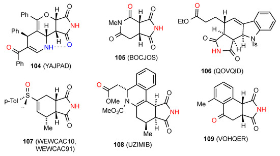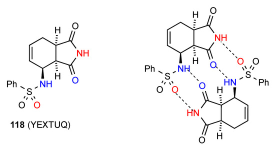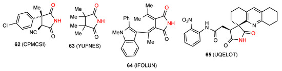 Five structures have been located for tri- and tetra-substituted succinimides. Three of these structures, compounds 62 [64], 63 [65] and 64 [66] (Figure 22) exist as simple hydrogen-bonded dimers, pattern A. Compound 65 [67] forms a ribbon structure of type B.