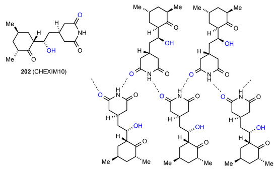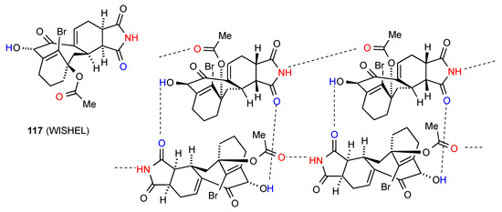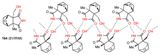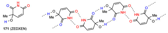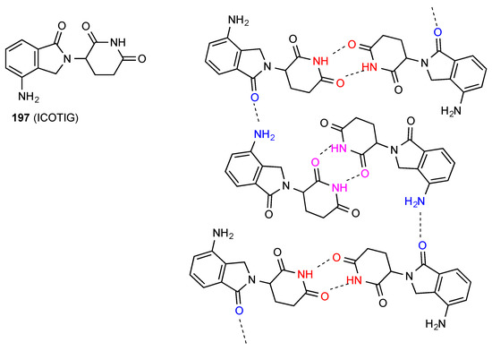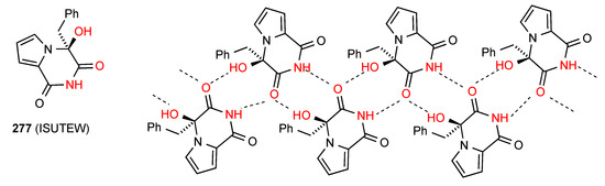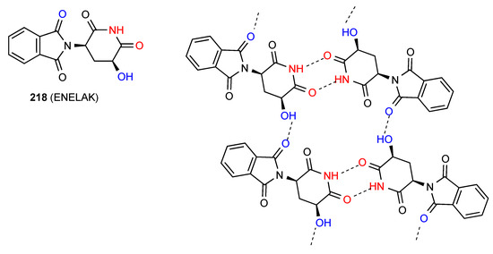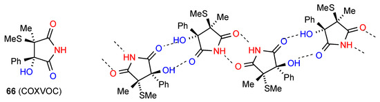 The remaining compound 66 [19,20] (Figure 23) has a more complex linkage. Two molecules dimerise, with imide NH and CO (methylthio side) interacting. The dimers are further linked to each other by the other imide CO bonding to the OH of another dimer. As for compound 31 this has designation C(10)[ R22(8), R22(10)]. The compound is racemic and the enantiomers alternate within the structure as shown.