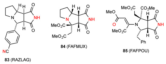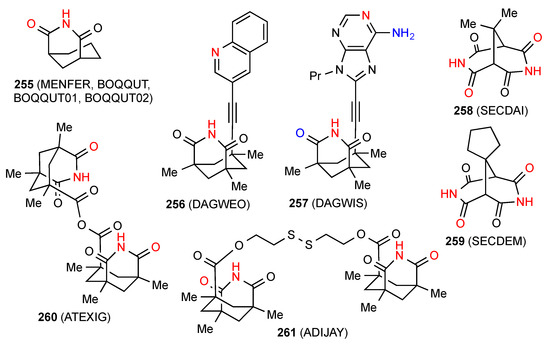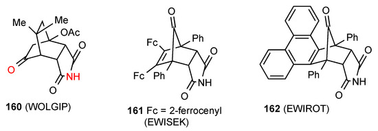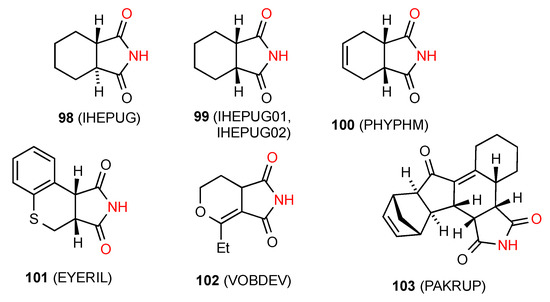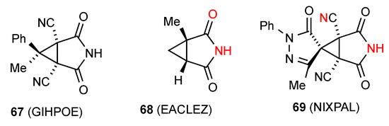 Among the three reported structures for succinimides fused with three-membered rings, compound 67 [68] (Figure 24) shows no hydrogen bonding probably due to the high degree of steric hindrance. Compound 68 [69] exists in a ribbon, pattern B. The remaining compound 69 [70] exhibits C(6) chains with the imide NH linked to the remote nitrogen of the CN substituent in the form of pattern E.