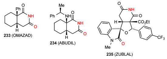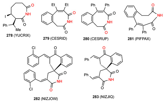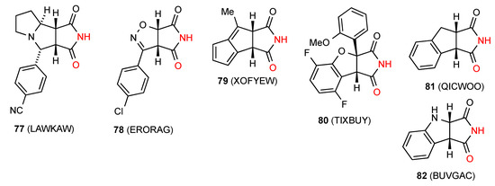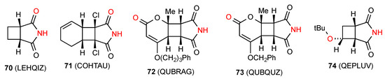 Of the seven reported structures for succinimides fused to four-membered rings, compound 70 [71] (Figure 25) exists as a linear hydrogen-bonded ribbon of type B. Compound 71 [72] exists as a square of four molecules in the rather uncommon pattern G (R44(16)). The compound 72 [73] exhibits a linear C(8) chain pattern F where the imide NH is bonded to the remote CO of the cyclohexenone ring. Two structures, compounds 73 [73] and 74 [74] exist as dimers of category D (R22(16) and R22(12), respectively) where the NH of the imide is bonded to the remote O of the other molecule.