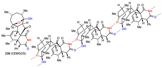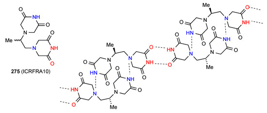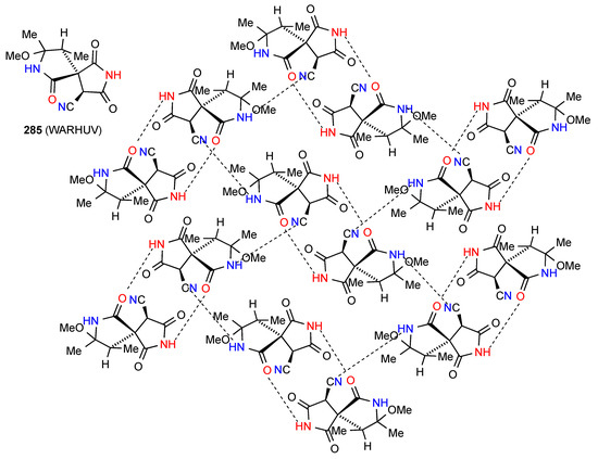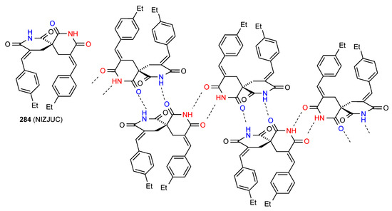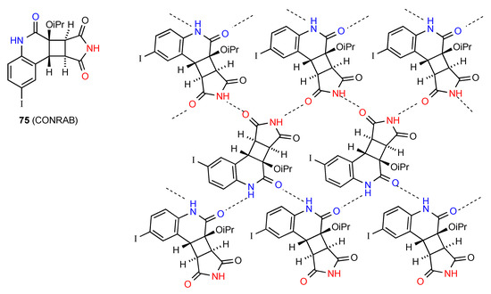 The two remaining structures exhibit more complex patterns of hydrogen bonding. Compound 75 [75] (Figure 26) forms a ribbon structure of pattern B, with the imide NH and the CO (away from the isopropyloxy substituent) interacting. Additionally, the NH and CO of the six-membered rings link to the corresponding groups on adjacent ribbons creating a two-dimensional network with the combination of the two C(4) interactions forming R44(23) units.