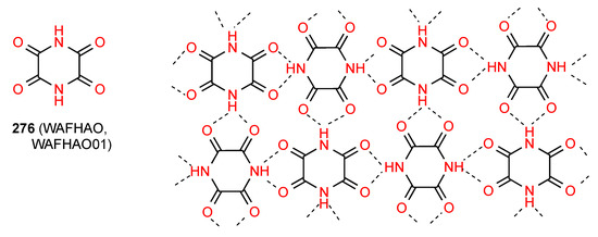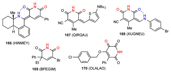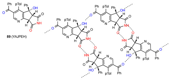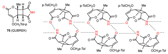 Compound 76 [73] (Figure 27) shows two linear antiparallel chains where each imide NH is bonded to the CO both of the pyranone ring of the next molecule in the same chain and to the one opposite in the other chain. Likewise, each pyranone CO is bonded to two imine NH groups, one in the same chain and one opposite to give a series of four-membered ring interactions holding the chains together. This pattern can be designated as C(8)R22(6) giving rise also to R22(16).There are no hydrogen-bonding interactions with the imide carbonyl groups.