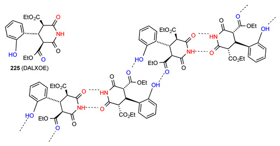 Three structures, 21, 22 [26] and 23 [27] (Figure 7) show a linear chain where the NH of the imides is hydrogen-bonded to a remote ester or ether oxygen (pattern F or C(8)). In the case of compound 23 there is an additional C(11) interaction between the phenolic OH and a further ether oxygen leading to cross-linking of the chains. Compound 24 [28] forms a linear chain with the imide NH bonded to the remote pyridine nitrogen (pattern E or C(9)) and additionally, an intramolecular (S(6)) hydrogen bond between the 2-NH on the pyridyl ring and the amide oxygen.