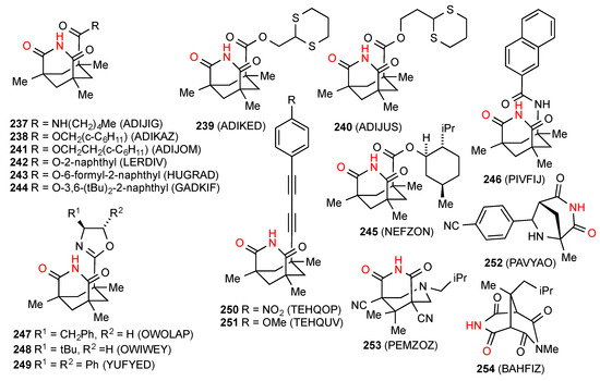 - Huang, W.; Qian, H.; Li, Y.; Chu, Z.; Gou, S. Crystal structure of D-(+)-camphoric imide. Anal. Sci. X-ray Struct. Anal. Online 2004, 20, x75–x76. [Google Scholar] [CrossRef][Green Version]