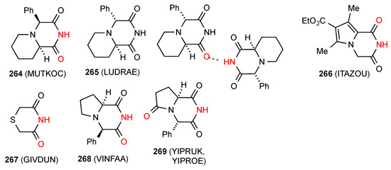 - Tkaczyk, M.; Dawidowski, M.; Herold, F.; Wolska, I.; Wawer, I. 13C CPMAS NMR, XRD and DFT study of selected 2,6-diketopiperazines. J. Mol. Struct. 2010, 975, 78–84. [Google Scholar] [CrossRef]